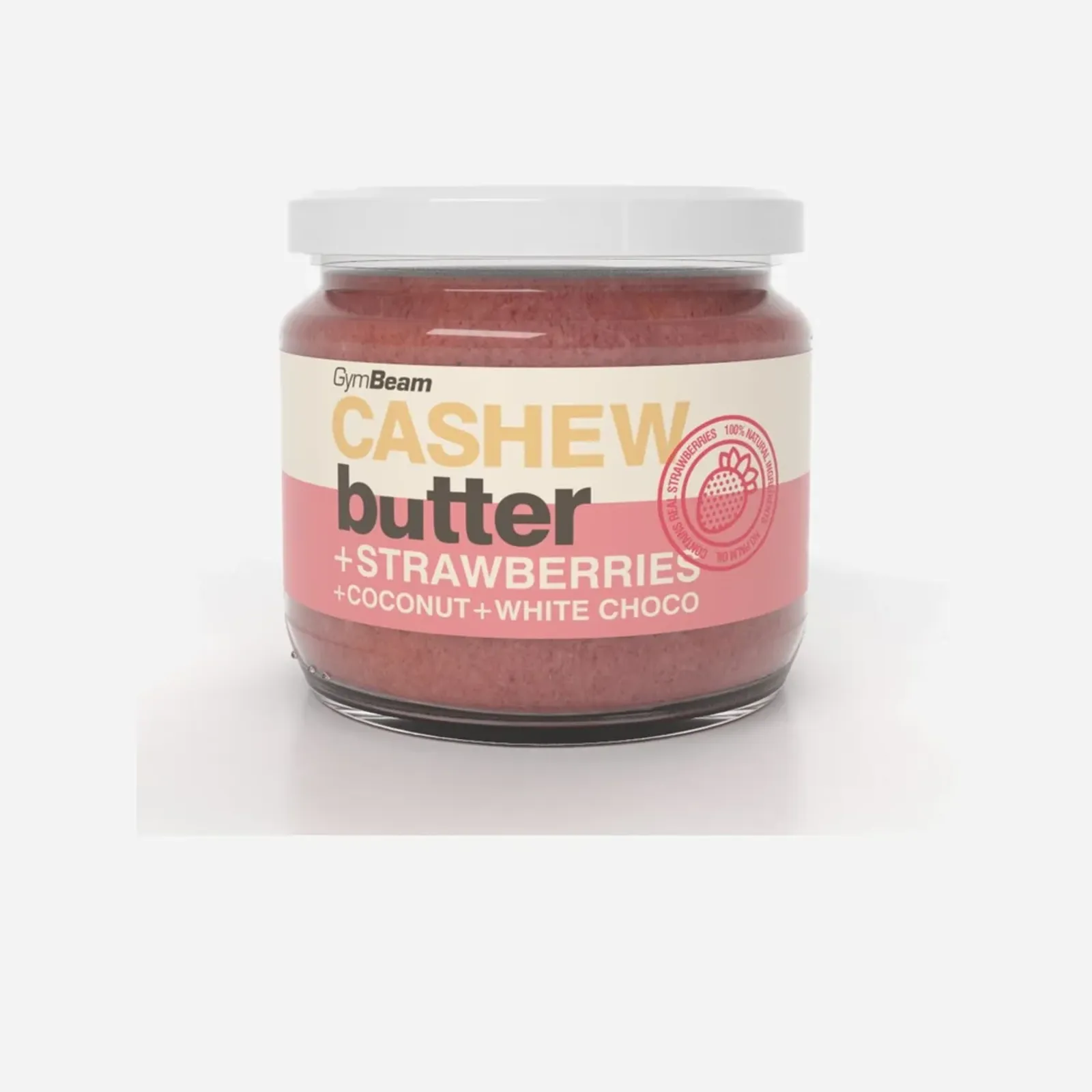 GymBeam Kešu maslo s kokosom, bielou čokoládou a jahodami, 340 g