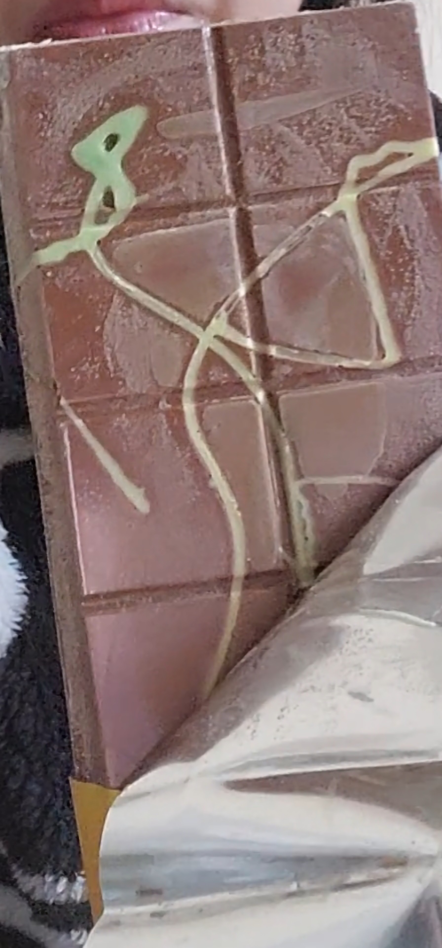 Čokoláda nejspíše nebyla skladována správně. Má na sobě tukový povlak a strany trochu rozteklé. Chuťově ujde. Za tu cenu zklamání.