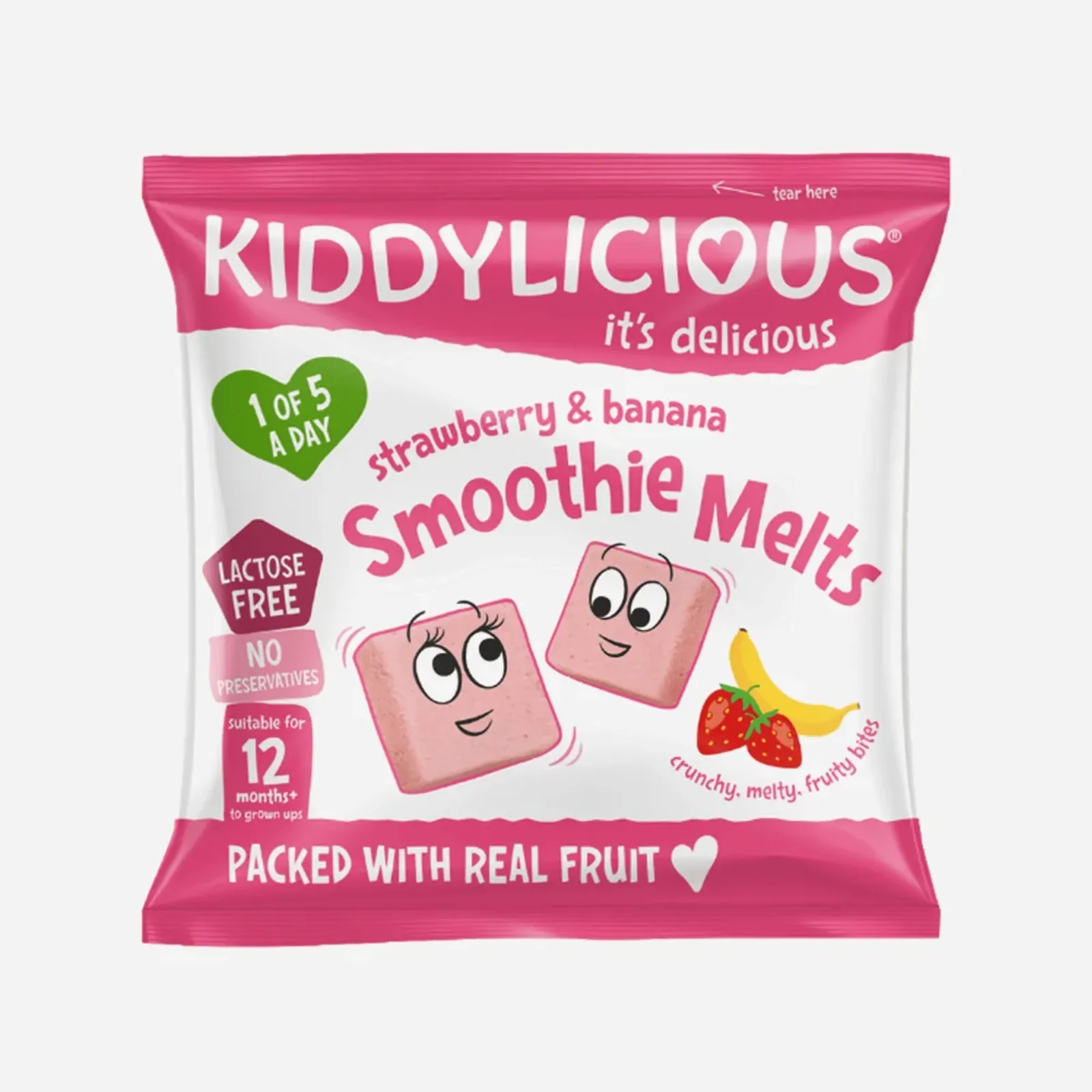 Ovocné vankúšiky Kiddylicious s jahodami a banánom sú vyrobené zo 100% ovocného pyré, ktoré poriadne premixujeme a vytvarujeme do chutných jednohubiek, ktoré sa rozpustia hneď, ako ich vložíte do úst. Sú perfektnou desiatou na cesty. Tieto ovocné vankúšiky obsahujú iba prirodzene sa vyskytujúce cukry.