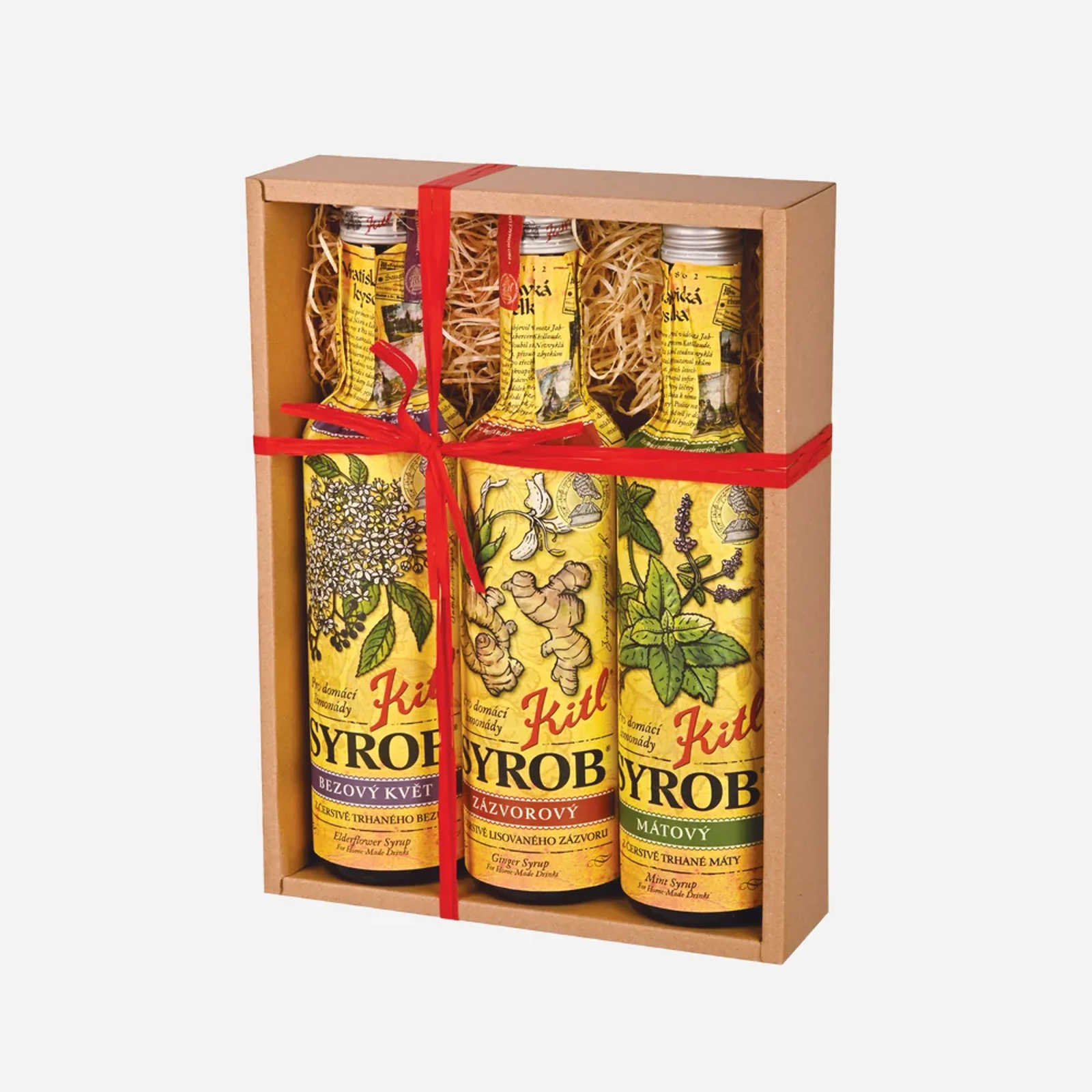 Darčekové balenie Bylinných sirupov Kitl. Obsahuje 3x 500 ml - Kitl Syrob Bazový, Kitl Syrob Zázvorový a Kitl Syrob Mätový. Sirupy sú skvelé na výrobu domácich limonád i horúcich nápojov.
