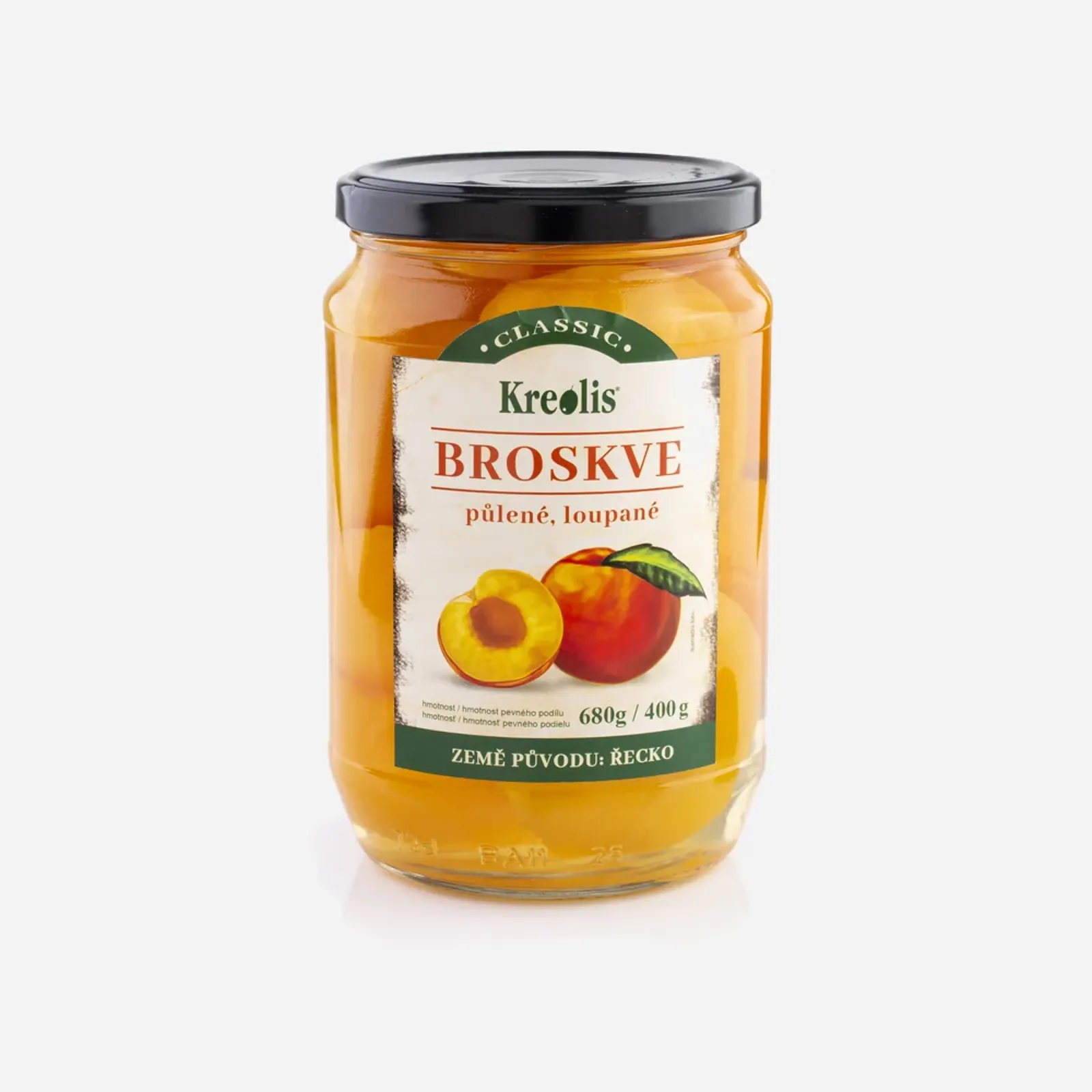 Broskyňový kompót vynikajúcej kvality. Ovocie Kreolis sa vo všeobecnosti vyznačuje nízkym obsahom cukru a najvyššou kvalitou spracovaného ovocia.