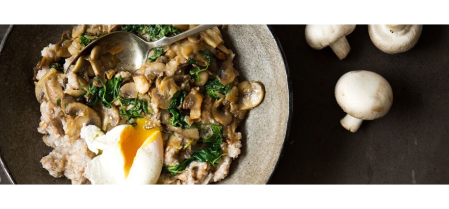 Kašu premiešajte so špenátom, cibuľkou a šampiňóny. Servírujte so strateným vajcom, podľa chuti dosoľte a okoreňte.