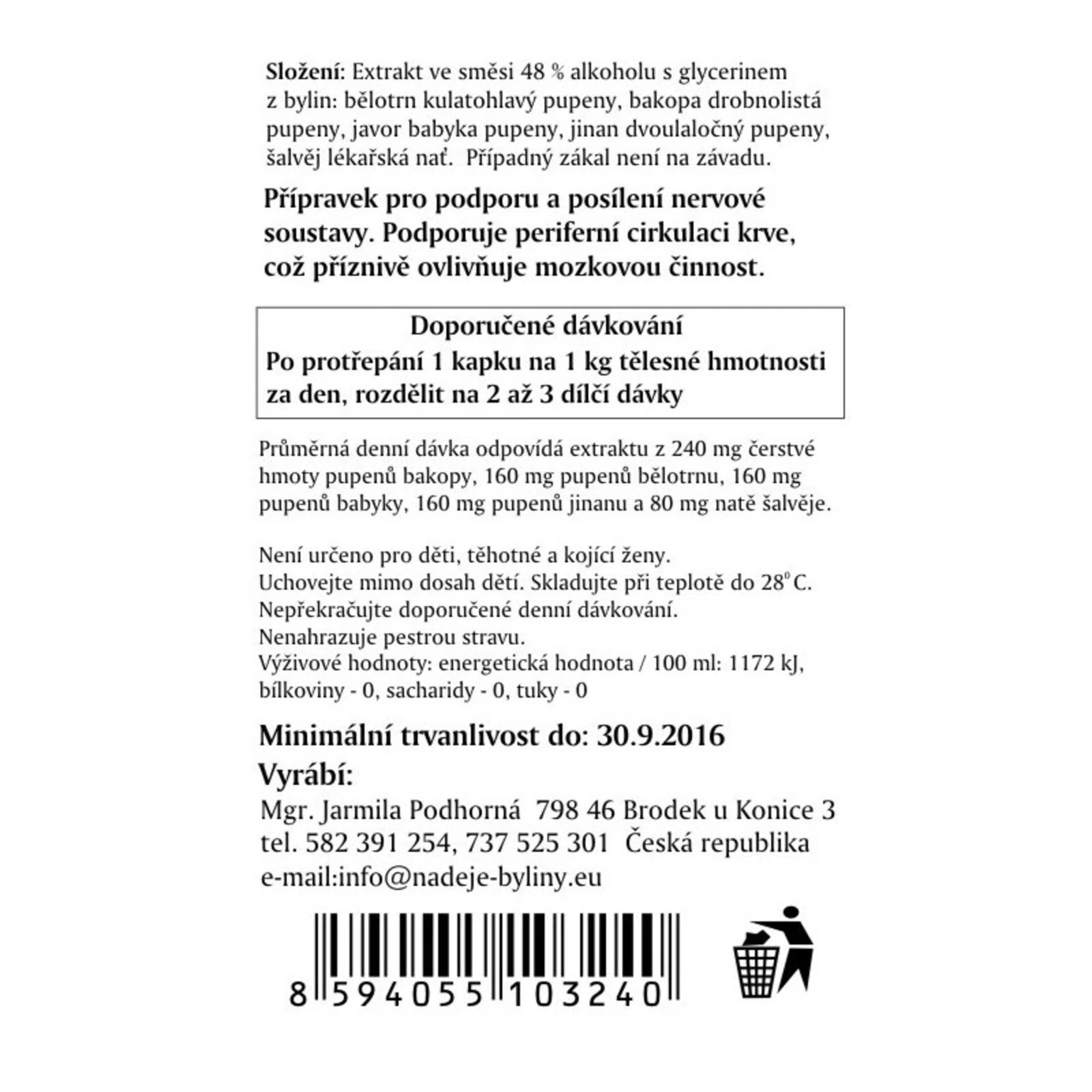 Zmes ježibaby kulatohlavej, bakopa drobnolistého, Javora poľného, ginka dvojlaločného, šalvie lekárskej. Podpora a posilnenie nervovej sústavy, udržovanie duševnej koncentrácie a pamäti, periférnej cirkulácie krvi, duševné uvoľnenie, stres, vek, menštruácia a menopauza.