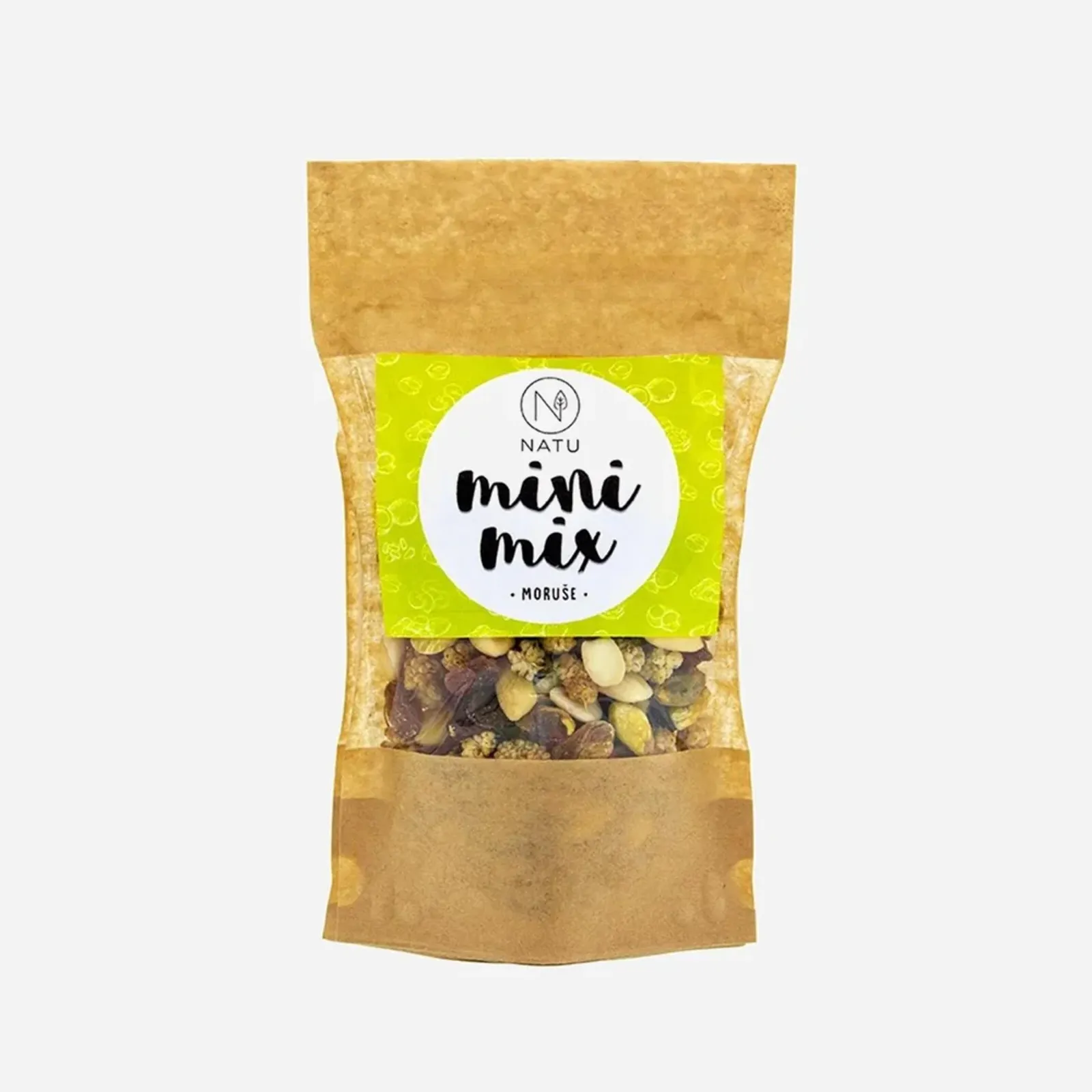 Mini Mix moruše je zmes pistácií, blanšírovaných mandlí, moruše bielej a hrozienok.