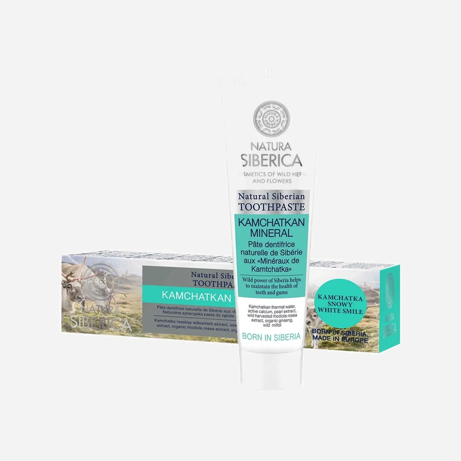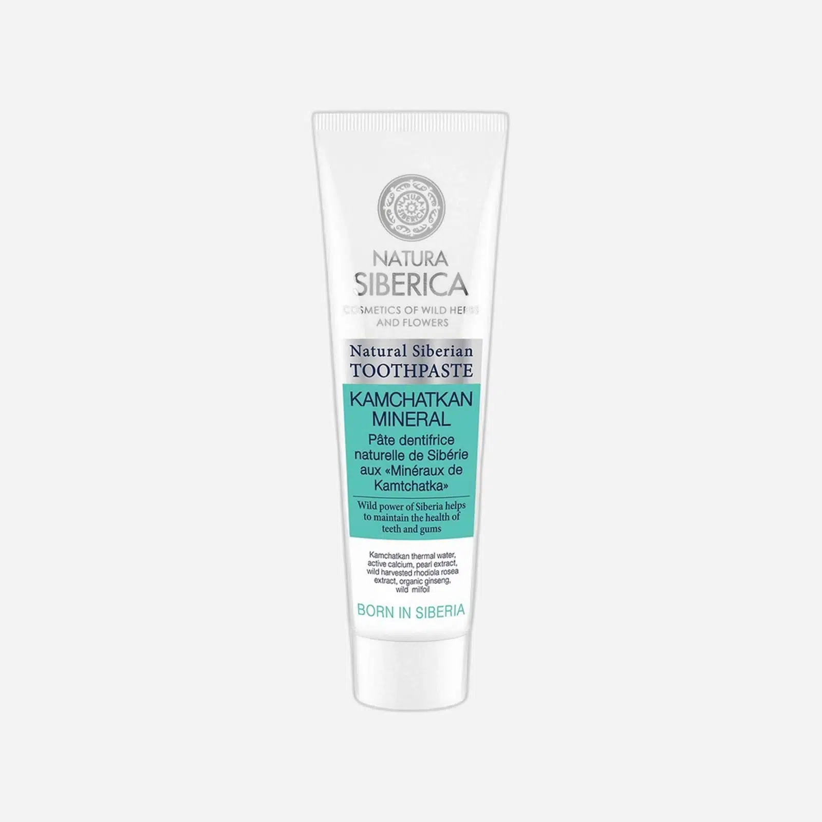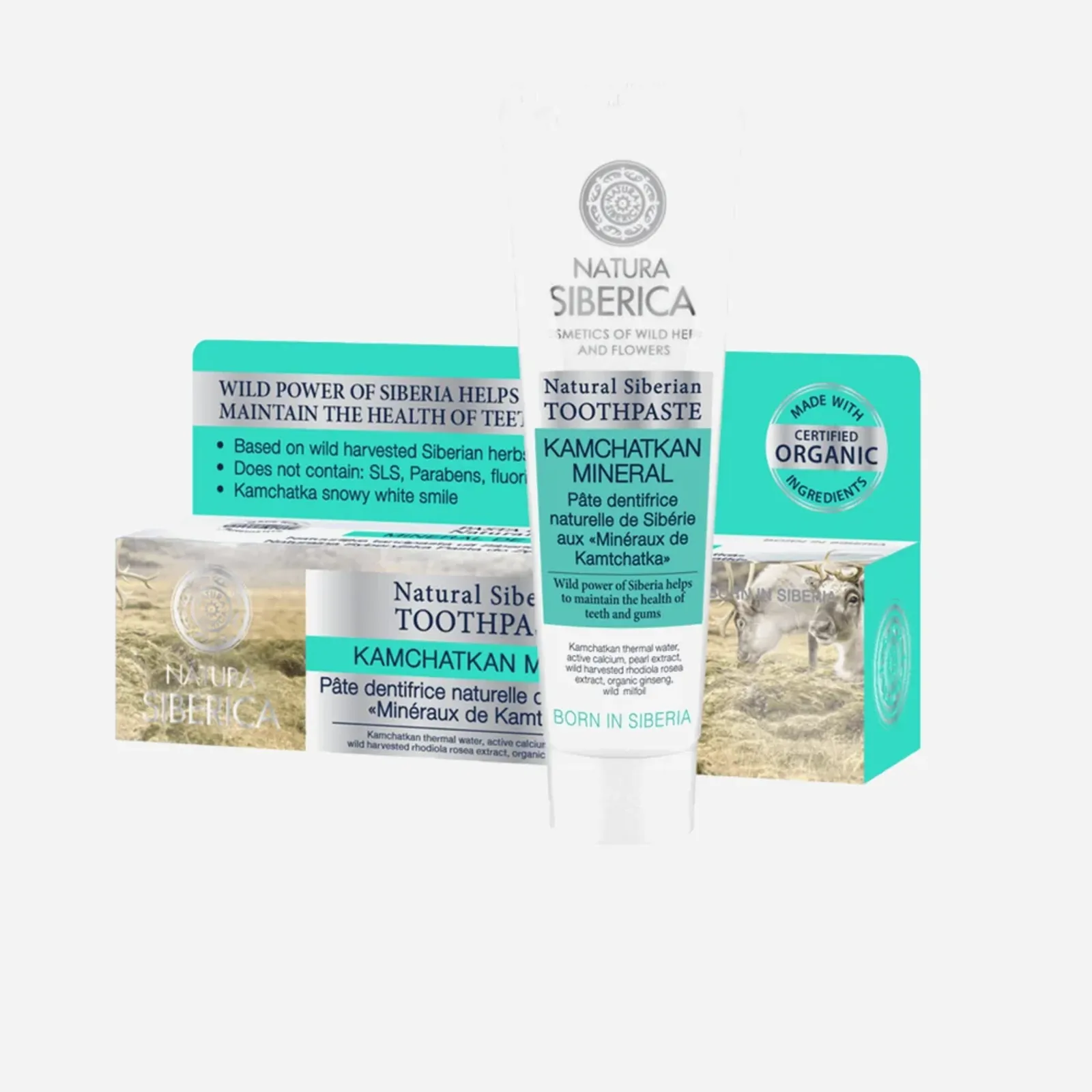 Sibírska zubná pasta Natura siberica Kamčatská minerálna dôkladne čistí zuby nielen od plaku, ale tiež od pigmentových škvŕn a súčasne je posilňuje vďaka soli z horských prameňov, vápnika a chitosanu. Pasta je obohatená o výťažky so sibírskych byliniek, ktoré jej účinky podporujú. Obsahuje mentol.