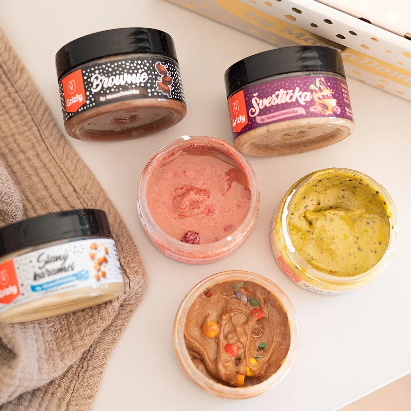 Každopádne náš Ochutnávkový set je takou vstupenkou do GRIZLY sveta by @mamadomisha. Nájdete v ňom ovocnou záhradkou inšpirované krémy Slivka a Malina, farebnú Lentylkádu alebo celkom zelenú Pistáciu. Zostavu dopĺňajú stálice Slaný karamel a Brownie. Nezabudli sme ani na FIT nadšencov a do setu sme pribalili FIT verziu Slaného karamelu, Pistácie a White Brownie. Ako vidíte, je naozaj z čoho vyberať. Stavíme sa, že keď vám Ochutnávkový set príde domov, nebudete vedieť, do ktorej skleničky sa pustiť skôr.