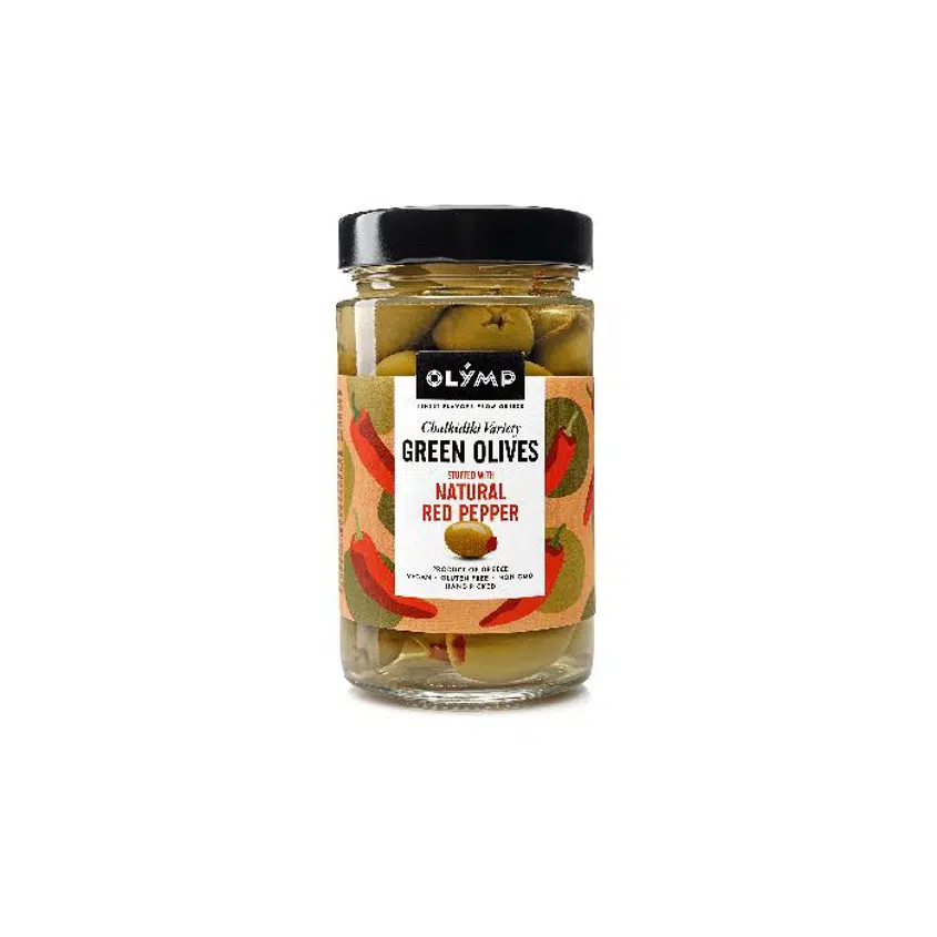 Grécke zelené olivy plnené kúskami červenej papriky naložené v slanom náleve.