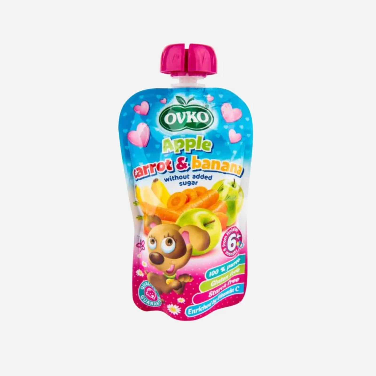 Zloženie: Jablkový pretlak 69,9%, mrkvový pretlak 20%, banánový pretlak 10%, aróniová koncentrát, vitamín C.