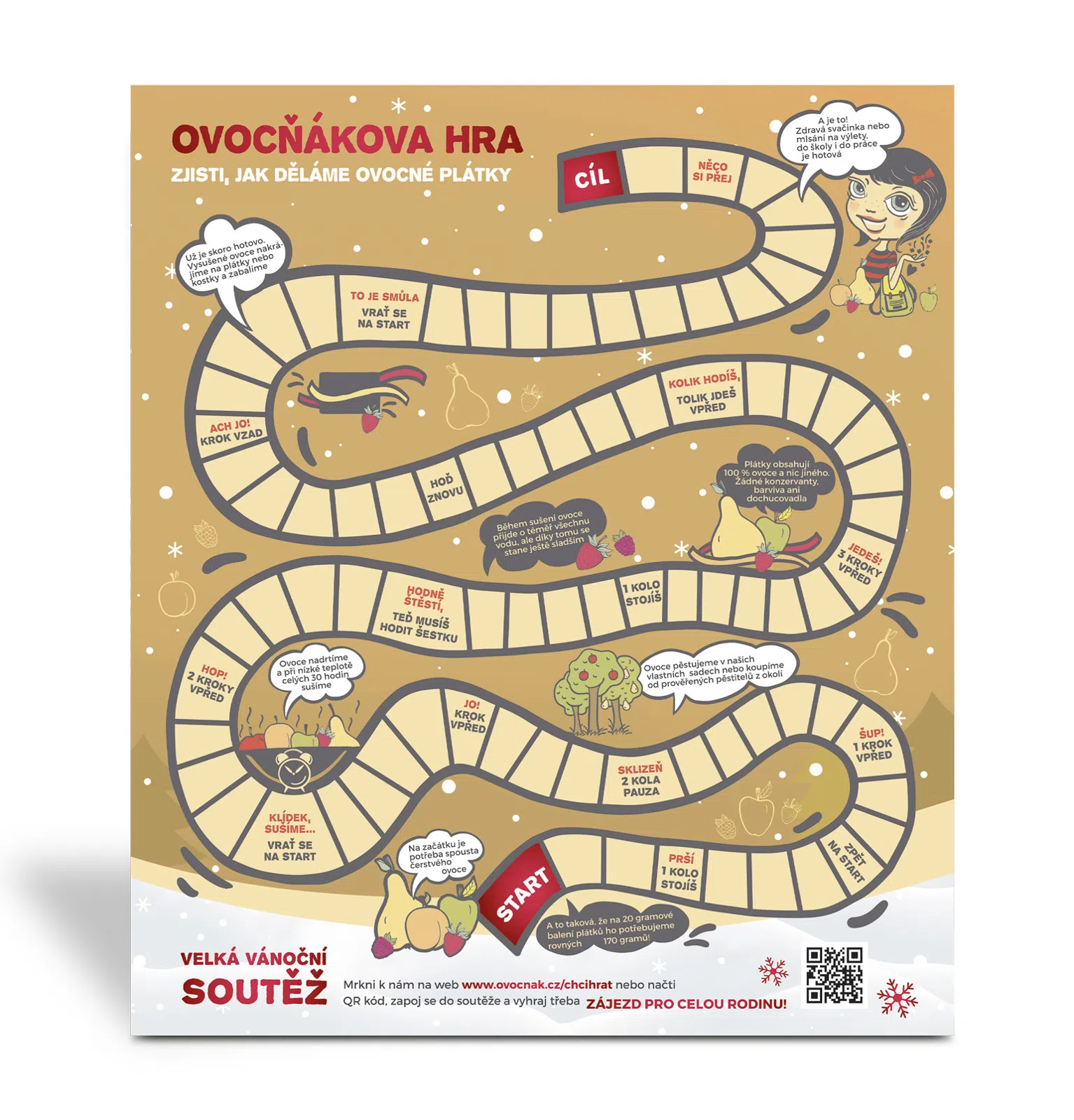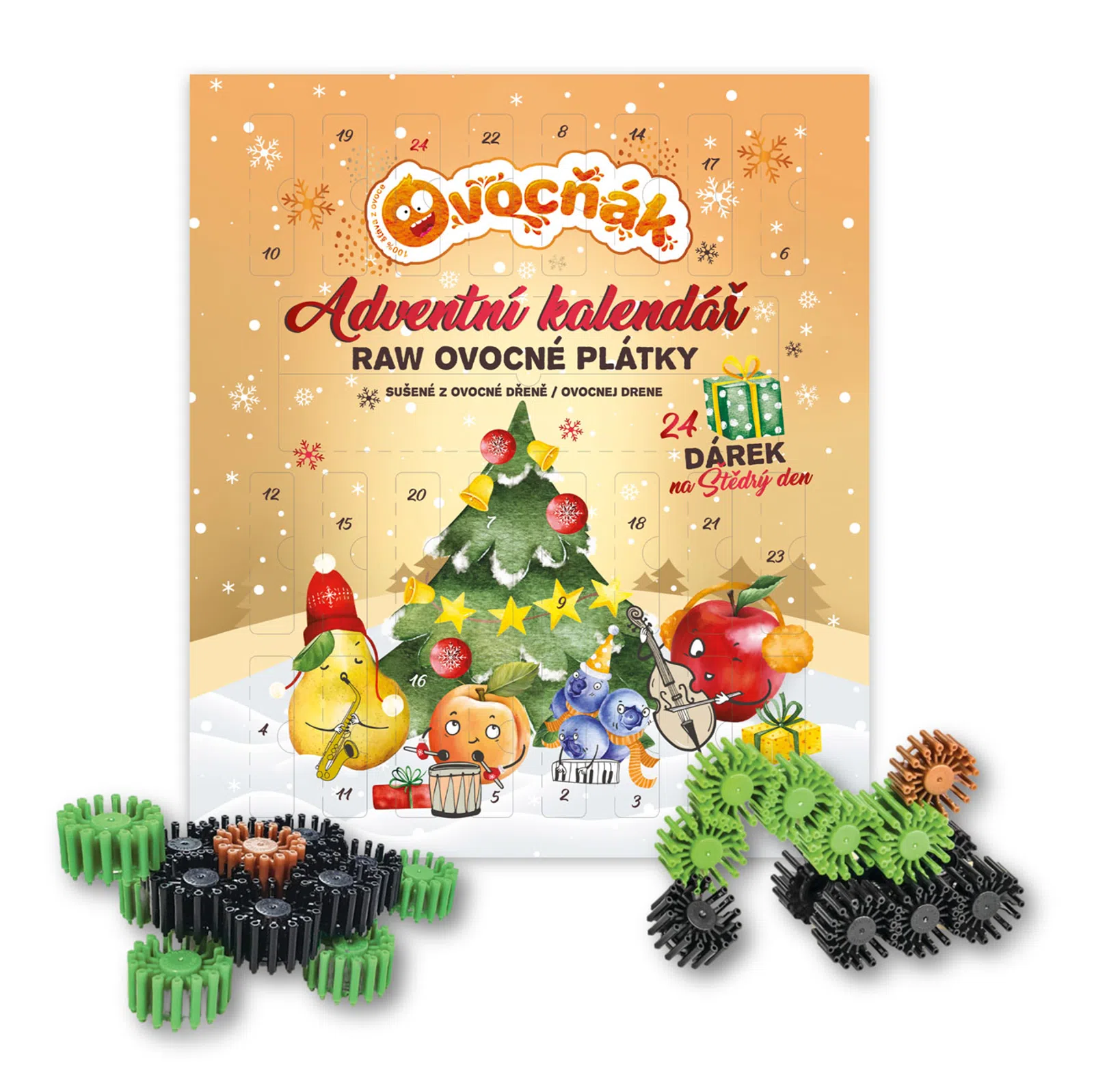 Na Štedrý deň ho čaká hračka v podobe 14 ovoviečok s návodom na poskladanie korytnačky alebo bagru a oči sa rozžiaria tým čo sa radi hrajú, pretože na zadnej strane kalendára hra pre celú rodinu s príbehom o tom, koľko práce je za tým, než vyrobíme ovocné plátky!
