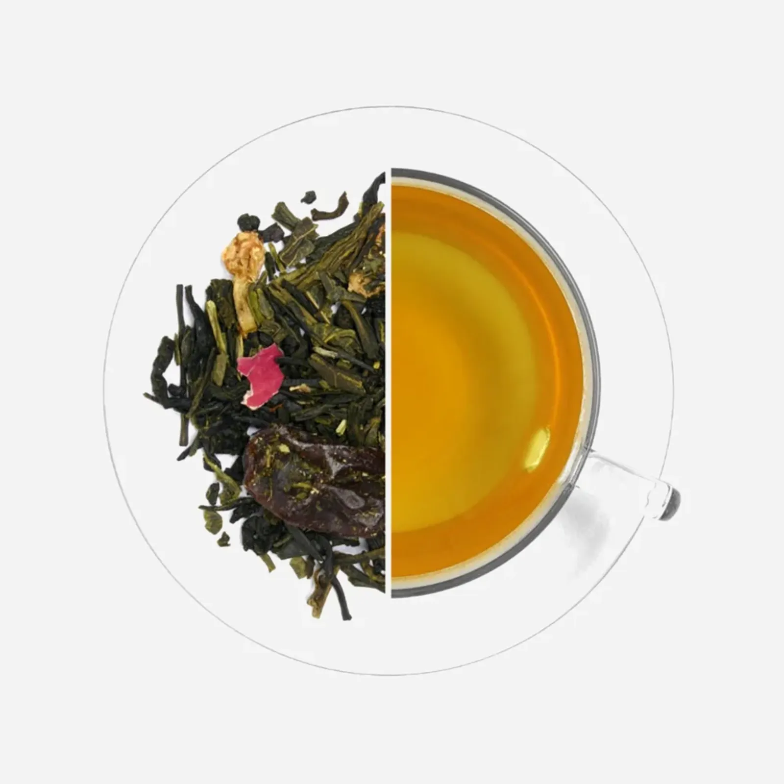 Pravý zelený čaj Sencha a China Jasmin s kvetmi s príjemnou chuťou černíc v kombinácii s chuťou jazmínu.