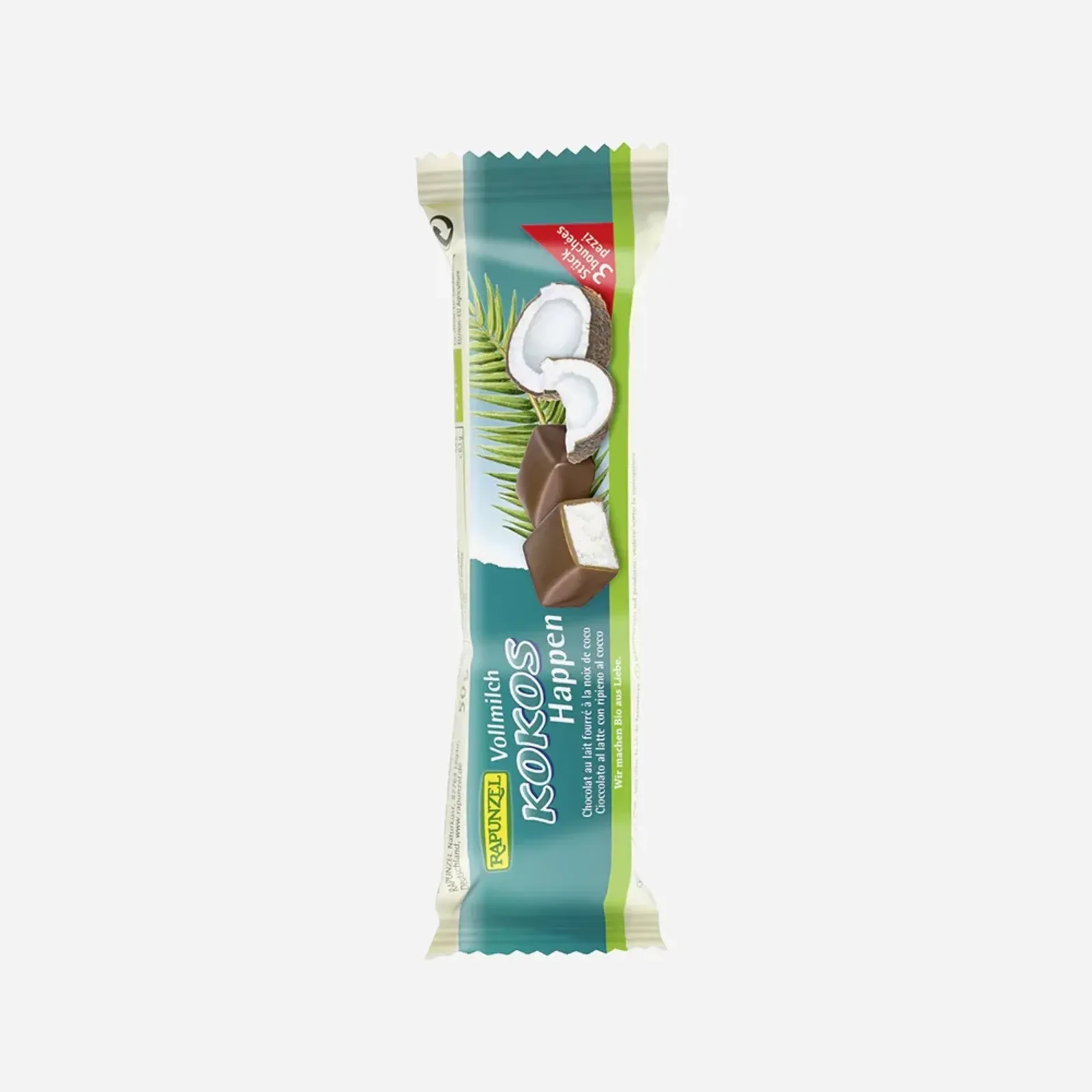 Každé balenie tejto kokosovej sladkosti obsahuje 3 bochníčky zmesi strúhaného kokosu so sirupom z ryže a agáve, obalené vrstvičkou mliečnej čokolády. Zmes nie je sladená trstinovým či repným cukrom, iba týmito sirupmi. Mliečna čokoláda obsahuje trstinový cukor. Výrobok môže obsahovať stopy lepku, takže nie je vhodný pre celiakov, ale pokiaľ sa lepku vyhýbate z diétnych dôvodov, je pre vás táto pochúťka vhodná.