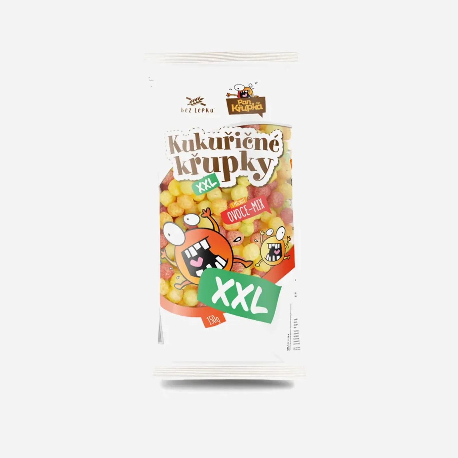 Extrudované kukuričné guličky s ovocnou príchuťou, najobľúbenejšie chrumky od pána Chrumky v rodinnom XXL balení. Limitovaná edícia.