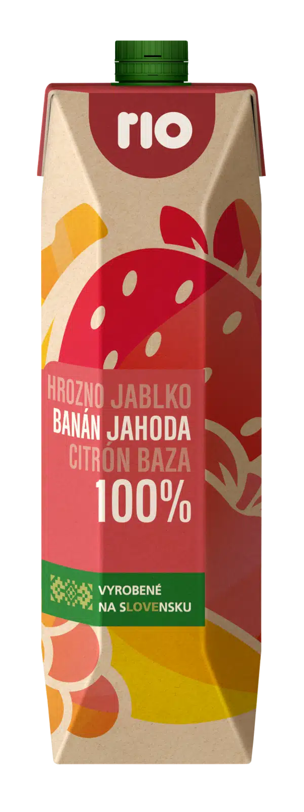 Rio 100% viacdruhová ovocná šťava vyrobená z koncentrátov, pyré, šťavy lisovanej za studena a drenia, s banánom a jahodou v ekologickom obale z obnoviteľných zdrojov.