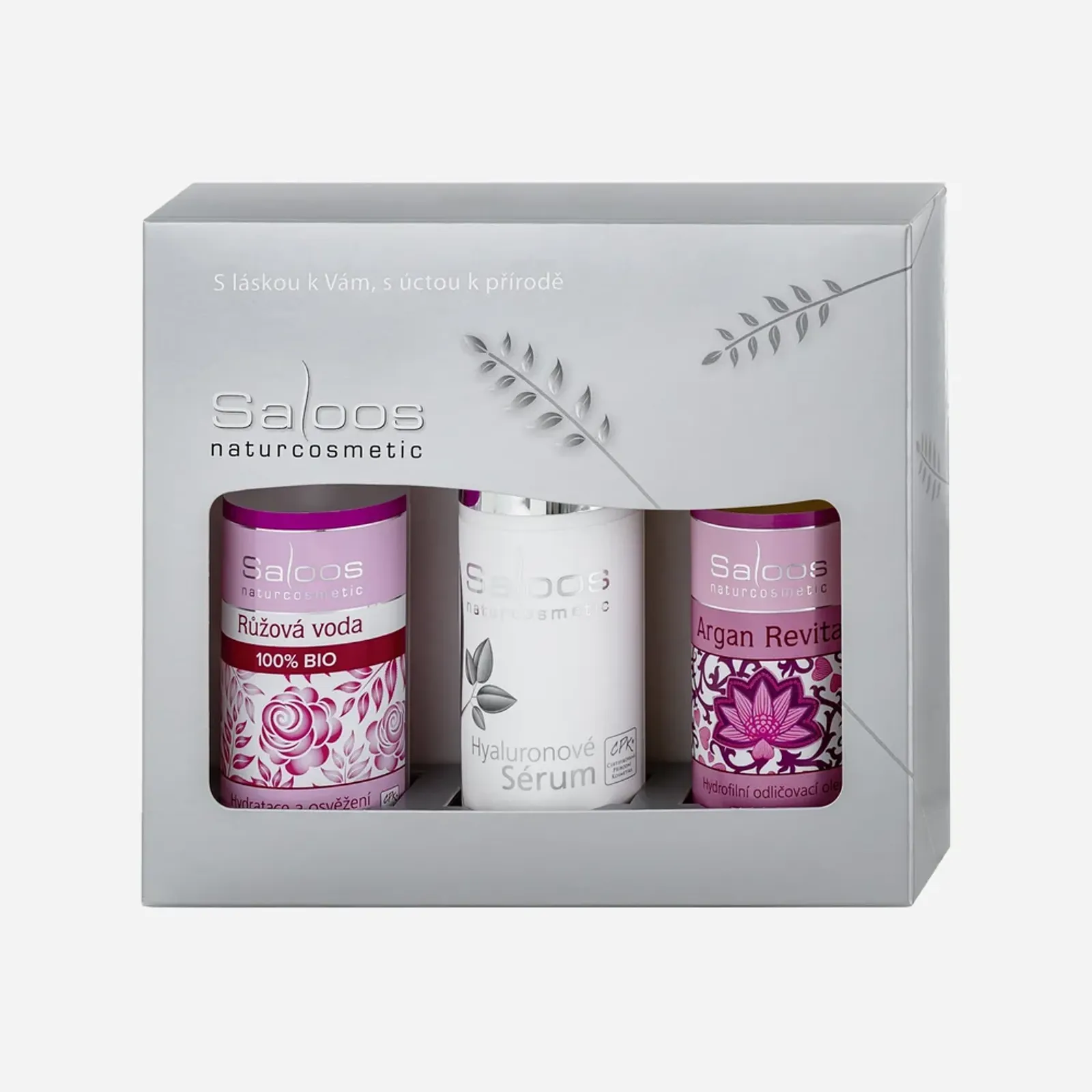Kozmetická sada troch produktov určených na hydratáciu a anti-age starostlivosť o pleť. Ružová voda poskytne hydratáciu, pleť tonizuje a vitalizuje. Hyalurónové sérum je určené na intenzívnu hydratáciu pleti, regeneráciu a vyhladenie. Hydrofilný odličovací olej dôkladne čistí a vyživuje pleť, odstráni aj vodeodolný make-up.