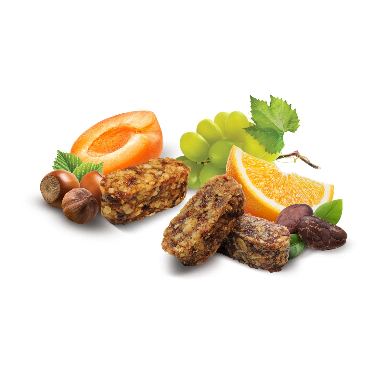 Zloženie: Datlová pasta 32%, klíčené ovsené vločky bez lepku* 29%, mleté hrozienka 12% (hrozienka 99,5%, slnečnicový olej), voda, slnečnicový olej, kakaové bôby 5%, pomarančový prášok 0,4%, morská soľ , pomarančový olej 0,1 %.