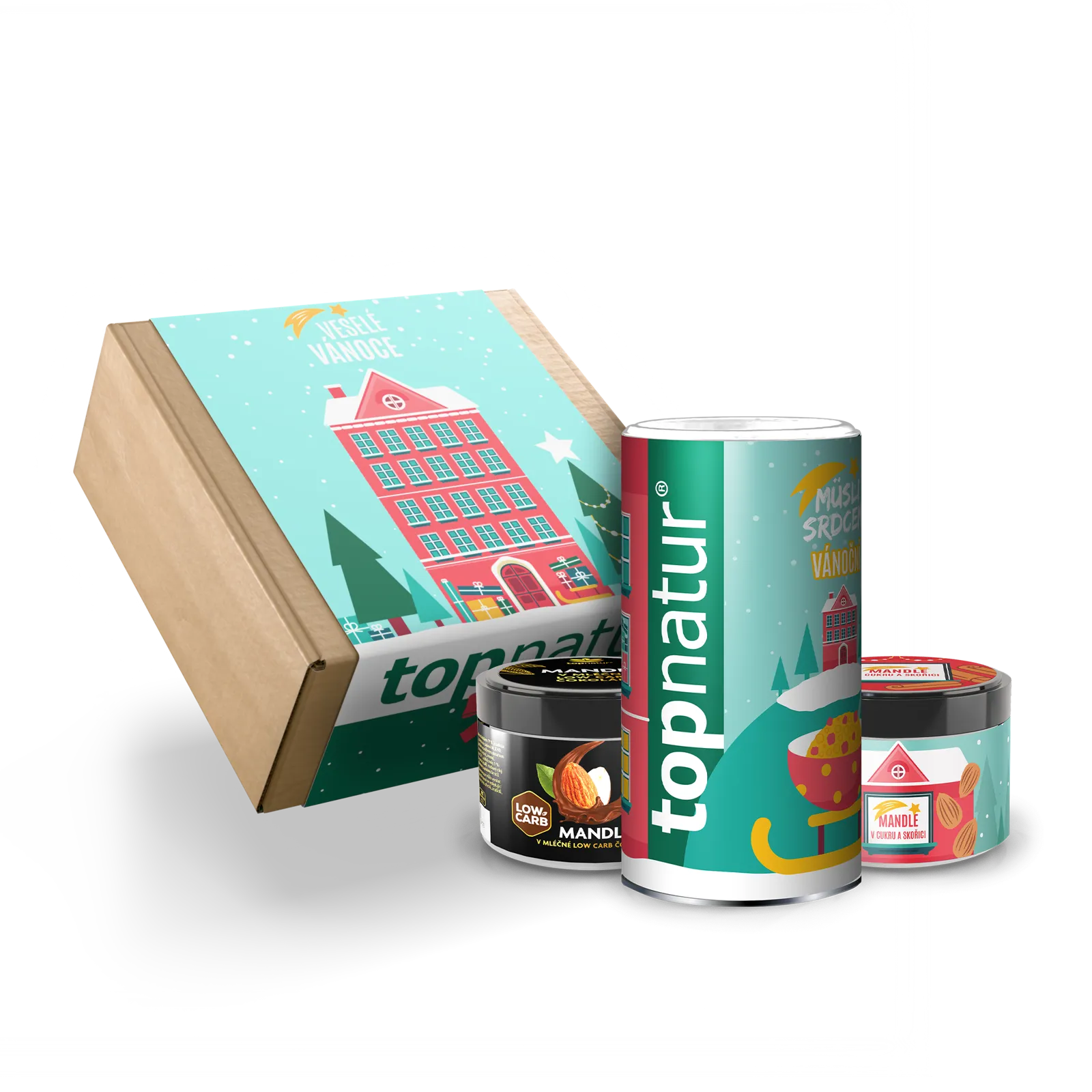 Vnútri nájdete voňavé Müsli srdcom Vianočné perníkové s chrumkavými orieškami a perníkovým korením, Mandle z pece v cukre a škoricu obalené v jemnej sladkej kruste a tiež Mandle v mliečnej Low Carb čokoláde – klasiku v odľahčenej podobe, ktorá nikdy neomrzí.