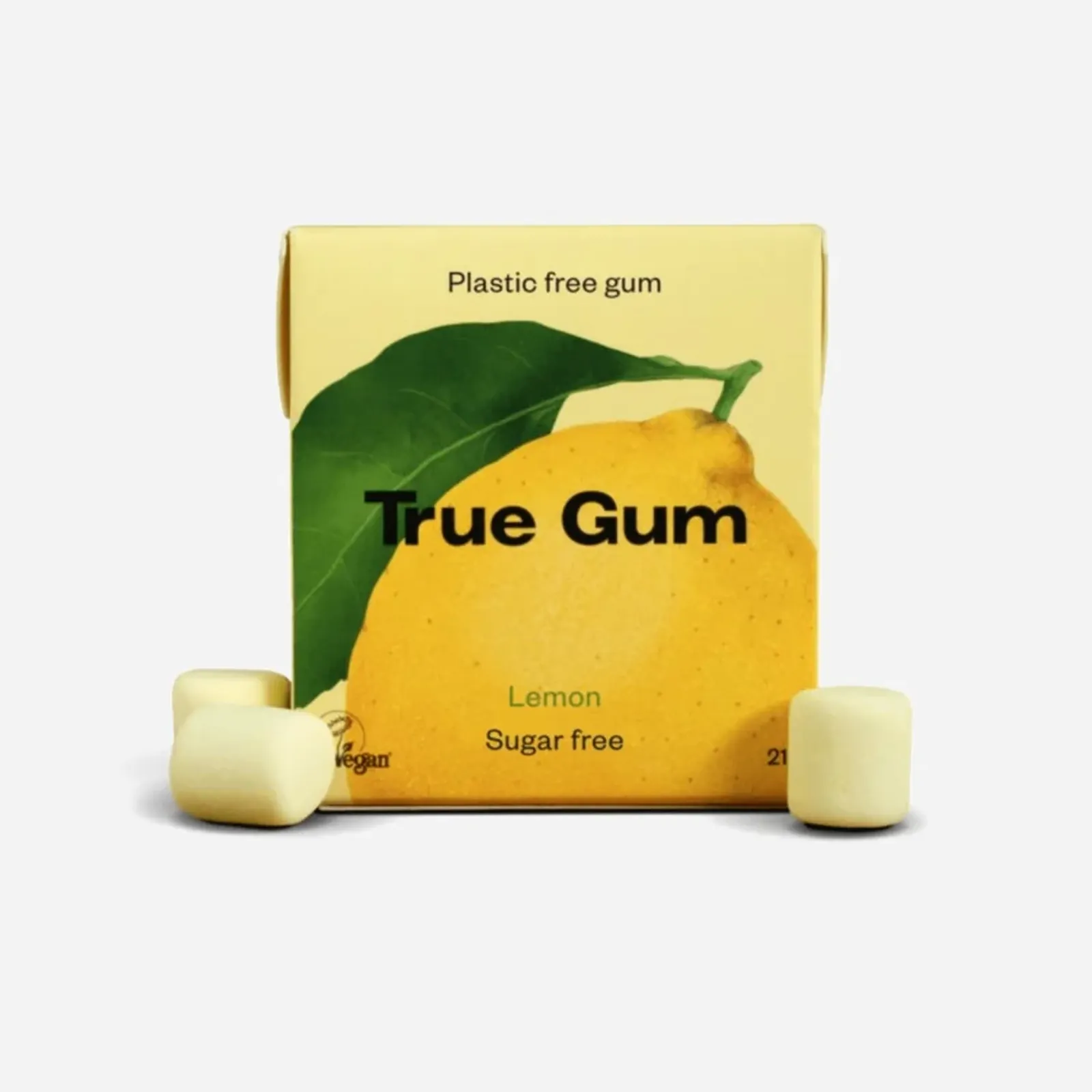 True gum žuvačka s príchuťou citróna bez plastov, bez aspartámu, bez umelých farbív a sladená xylitolom. Neobsahuje palmový olej a má certifikáciu vegán.