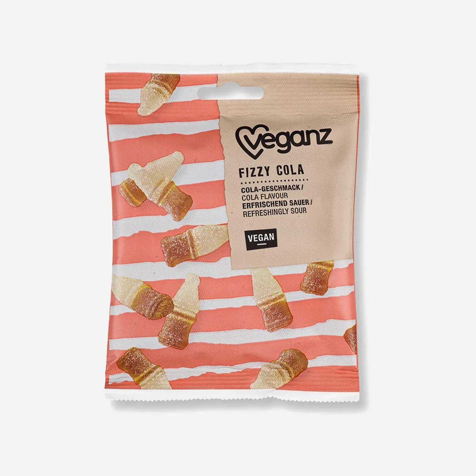 Kyslé cukríky v tvare fľaštičky s príchuťou coly od nemeckej udržateľnej značky Veganza. Hoci gumové, sú bez želatíny, umelých farbív a konzervantov.