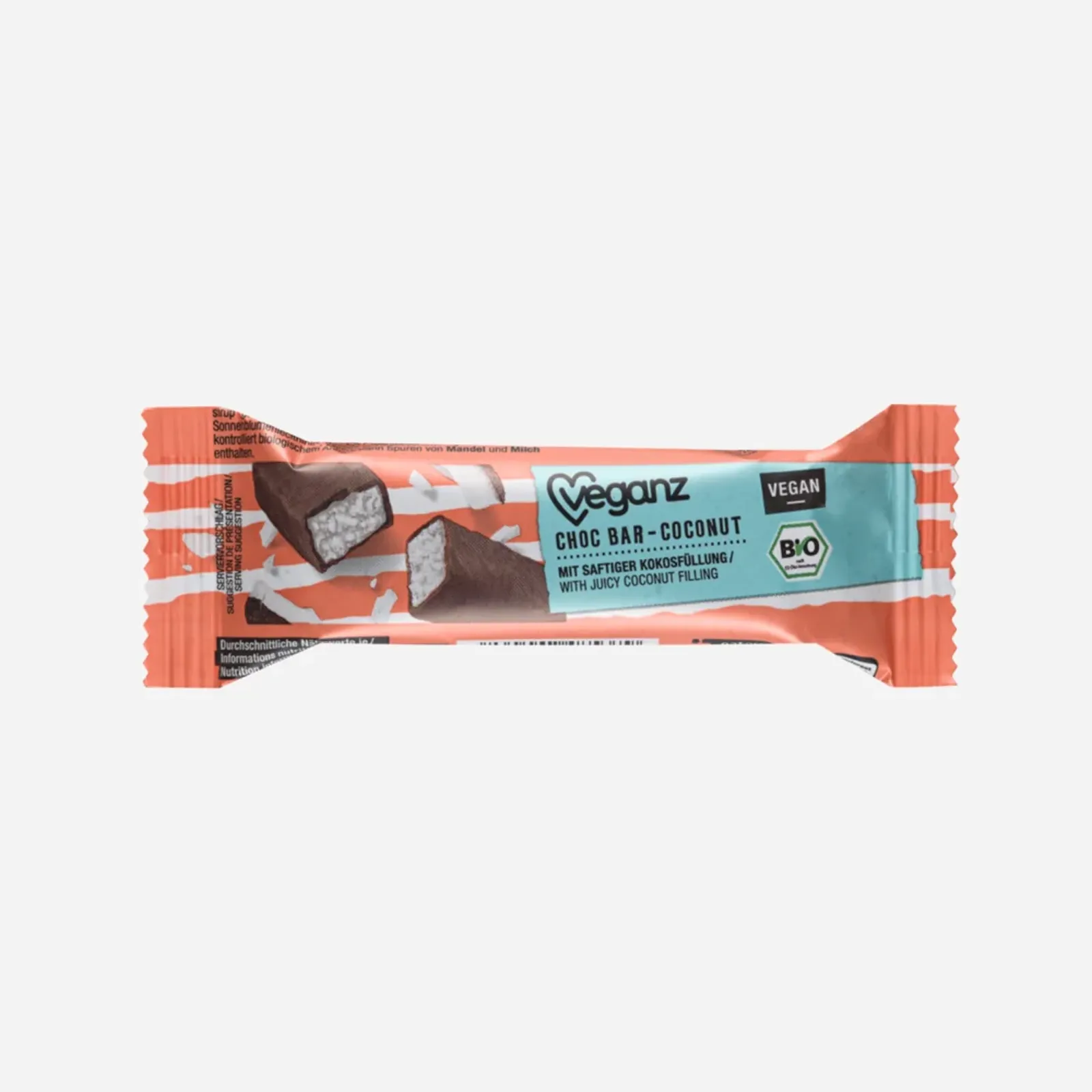 - Zloženie: Strúhaný kokos * (35%), trstinový cukor *, kakaové maslo *, inulín *, sušený ryžový glukózový sirup *, kakaová hmota *, pražené lieskové orechy *, emulgátor: slnečnicový lecitín *; morská soľ, mleté vanilkové struky *. Min. podiel kakaa v čokoláde 38%. * Z kontrolovaného biologického poľnohospodárstva. Môže obsahovať stopy MANDLÍ a MLIEKA.