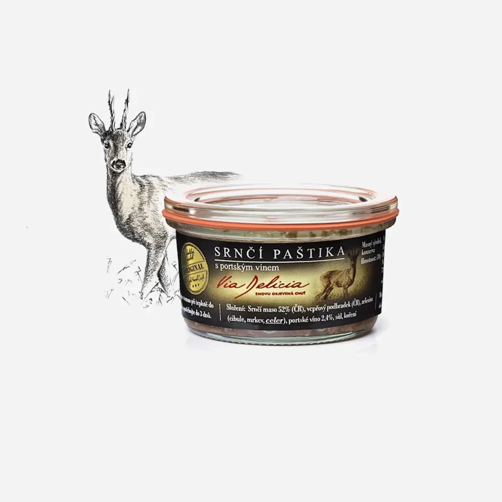 Srnčie mäso je veľmi vyhľadávané pre svoju chuť aj dnes. V starých receptúrach sa často kombinuje so sladkým vínom. Dovolili sme si teda vytvoriť hrubo mletú paštétu s prídavkom portského vína, ktoré dodáva paštéte nezameniteľnú chuť.