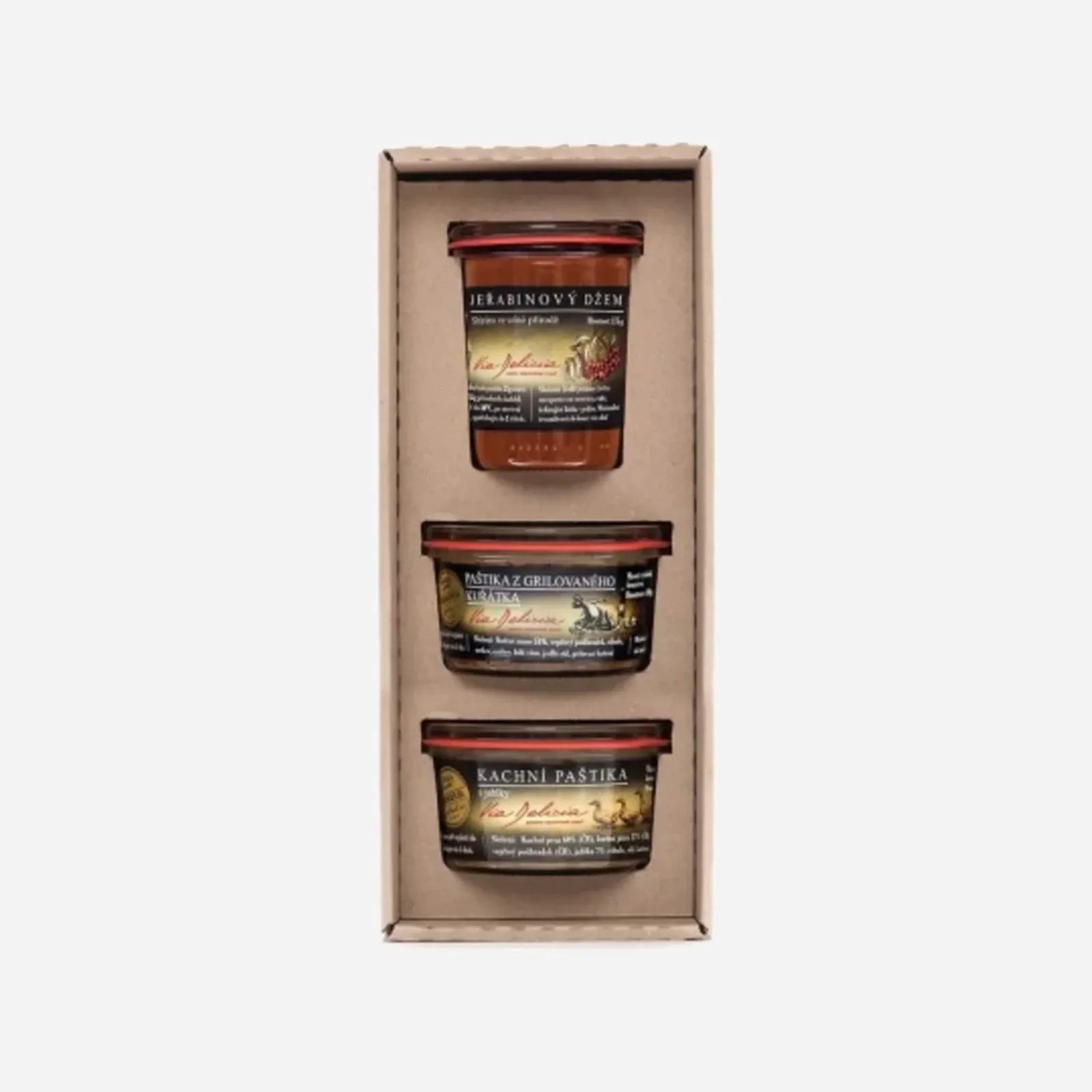 Vidiecke trio je darčeková kazeta zložená z dvoch paštét a jedného džemu.