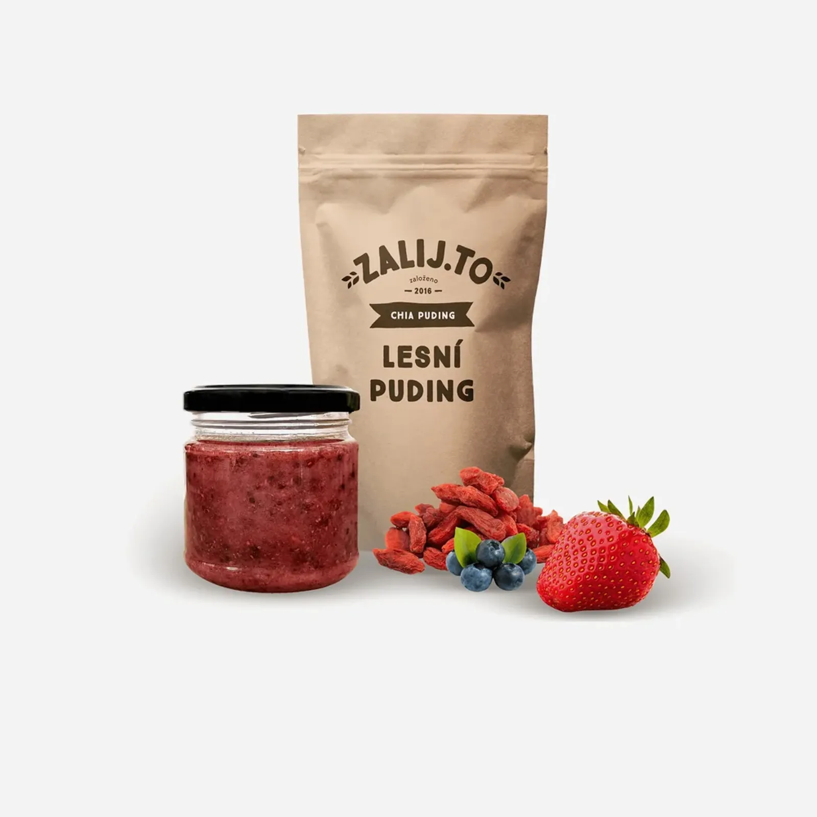 Lesný chia puding v prášku je zložený z kokosu, lyofilizovaných ríbezlí, čučoriedok a jahôd, skaremalizovaného kokosového nektáru, kustovnice čínskej a chia semienok.